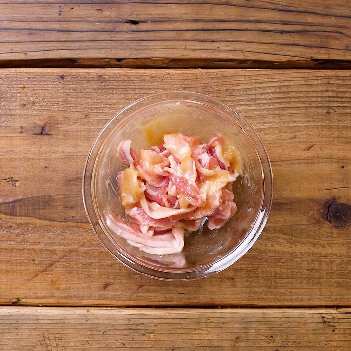 2: ボウルに【下味】を入れてよく混ぜ、豚バラ肉を加えて混ぜます。