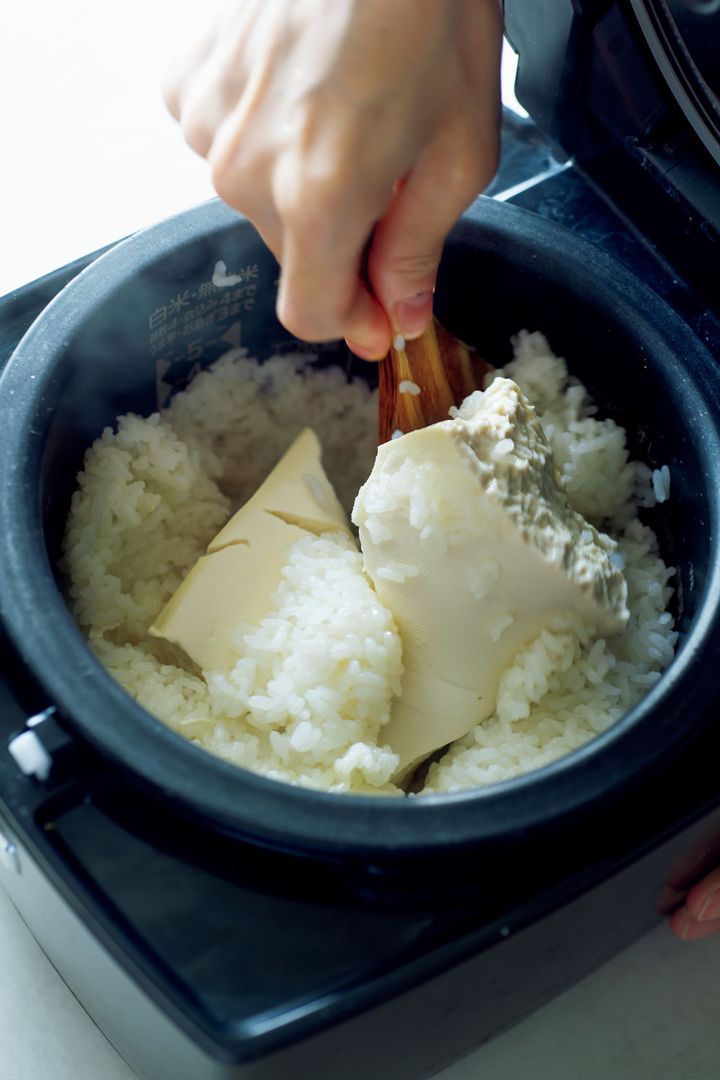 「炊き込みご飯が大好き!」という料理家の長谷川あかりさん。今回教えたもらったのは、なんと豆腐をまるごと使った炊き込みご飯です。豆腐をまるごとのせて炊く、 という大胆な一品。ベースの味はごくシンプルにして、 好みのトッピングでいただきます。