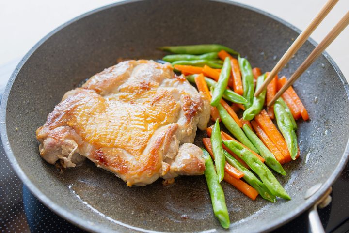 鶏肉の皮目が焼けたら裏返して、ペーパーで余分な油を除き、横で細切りにしたニンジンといんげんを一緒に焼き上げます。