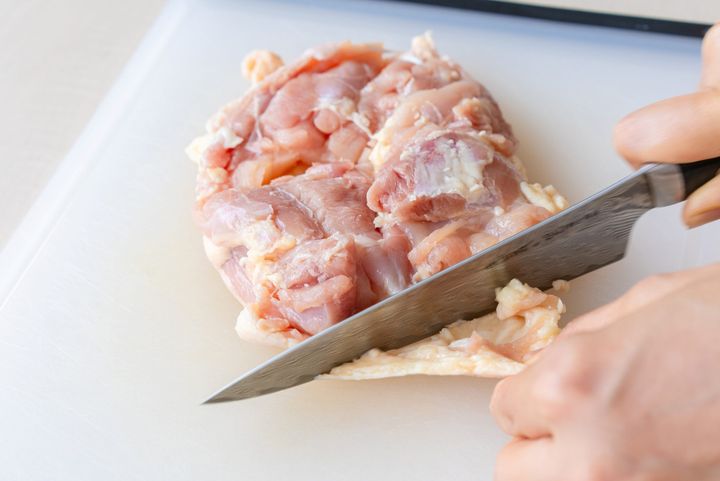 ペーパーでしっかり水気を取って臭みを除き、余分な脂や皮や筋を丁寧に切り落とします。