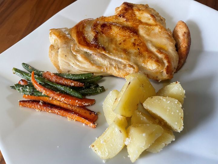 夫:チキンソテーは焼くだけでおいしいけど、野菜も添えたくなるよね。
