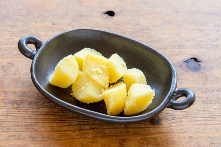 じゃがいもを茹で、やわらかくなったら水を捨てて鍋を振りながら粉吹き芋にし、塩・こしょうで調味。粗熱が取れたら粉チーズでさっと和えます。