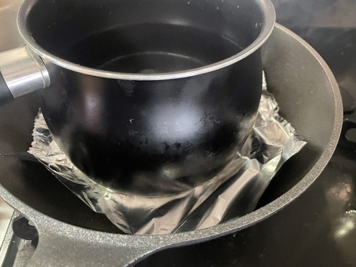 皮目から焼き、ターナーで押し付けて焼いたり、写真のようにアルミホイルを敷き、水を入れた小鍋などを上に置いて押し付ける方法もおすすめです。
