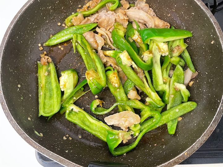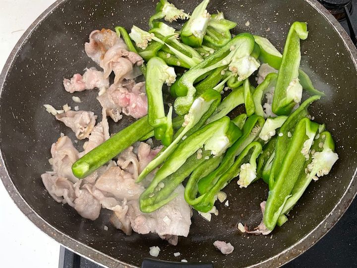 3. ピーマンをワタごと加え、油を絡めながら炒めます。
