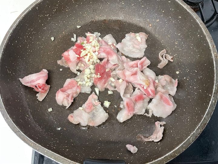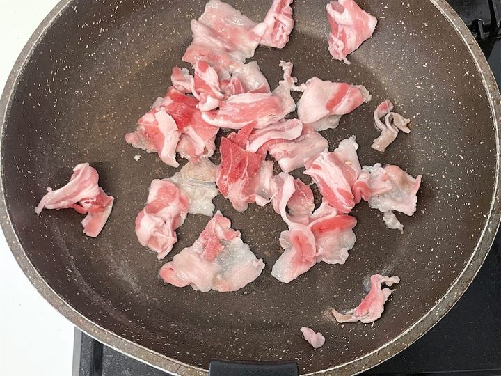 1. フッ素樹脂加工のフライパンに油を引かず、中火にしたら豚肉を入れ、片面を軽く焼きます。