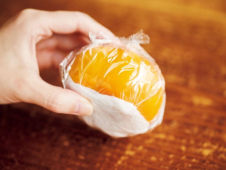 柿はへたの部分から水分が蒸発していくので、へたが乾燥すると鮮度が落ち、柔らかくなってしまいます。水で湿らせたペーパータオルをへたにのせ、一つ一つラップで包み、へたを下にした状態で冷蔵保存すれば、シャキシャキ食感を長くキープできますよ。
