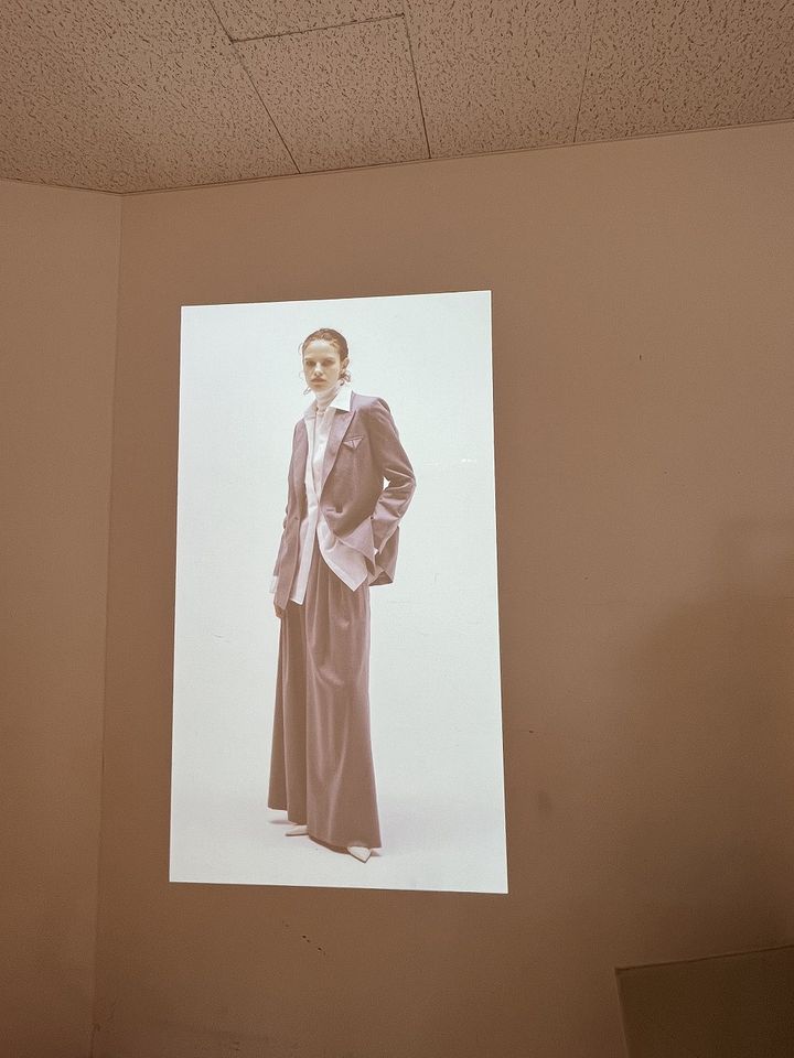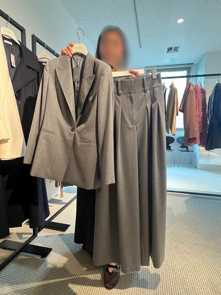 ウエストが適度に絞られたダブルブレストジャケットとタックがきれいに入った存在感のあるワイドパンツのセットアップは着る人に自信を与えてくれます。高級メゾンも使用するイタリアメーカーの素材で、肌触りが良く滑らかで、きちんと感があるけど着心地がとても良かったです。