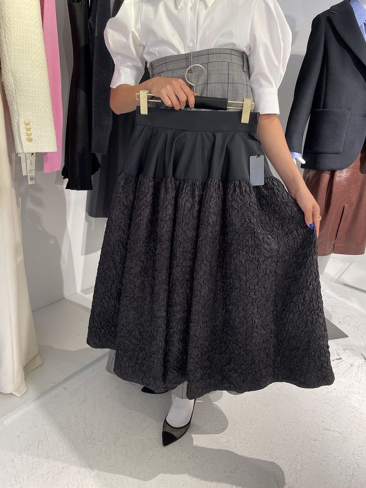 4.ジャカード素材で一枚で華やぐ「コクーンスカート」