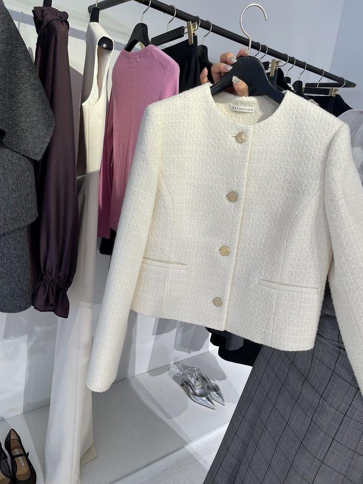 エストネーションでも定評高いツイードジャケット。毎回アップデートされているイメージです。ボタンやポケット、サイズ感、素材の感じがアップデートされて毎シーズン登場します。シーズンごとに変わるので気に入った時に購入すると決めている人も!今年は白ツイードが登場する予定。コンパクトなシルエットのクロップド丈ジャケットで、メタルボタンはスカルプチャーをイメージして作ったオリジナルのボタンです。ON や OFF のシーン対応出来るよにサイズ感やシルエットにもこだわったアイテムです。