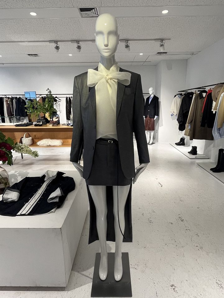 展示会場に入り、まず目を引いたのはこちらのジャケット&ミニスカートのセットアップ。ベターは、メンズアイテムの在庫をアップサイクルしてデザインしているウクライナのブランド。マニッシュで落ち着いたグレージャケットに大胆なスカートとボウタイブラウスをあわせてドラマティックな印象を与えていました。挑戦的なアイテムですが、ミニが流行っている今だからこそ冒険してみたい人に!