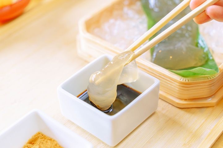 コシがあるため、箸で持ち上げるとギュインと伸びます。深く焙煎した京きなこと、沖縄県産黒糖を100%使用した黒蜜につけていただきましょう。