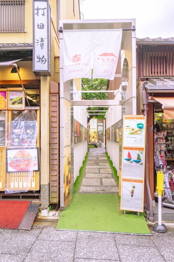 「普門茶屋」は、そんな清水坂の中腹に位置する和カフェ。入口は道路に面した店舗と店舗の間1mほどです。見落とさないように、「FUMON」と書かれた白いのれんと和スイーツの看板を目印に、細い通路を奥へと進みましょう。