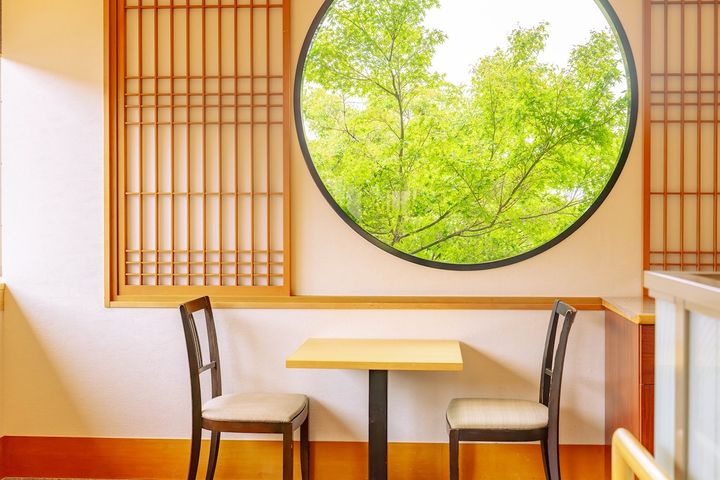 円窓から見える緑と格子デザインとが京都らしく、思わず写真を撮りたくなります。