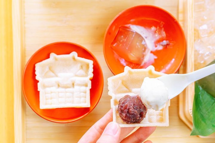 セットの最中は、セルフで皮につぶ餡・アイス・わらび餅を挟んでいただきます。パリパリの皮とねっとり濃厚なつぶ餡、クリーミーなアイス、もちもちのわらび餅という、多彩な食感にニンマリ。