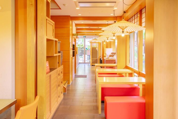 店内は“モダンな門前茶屋”をコンセプトに、屋外でお茶を嗜む席・野点(のだて)をイメージしたデザインに。和傘がモチーフの照明や、朱色の椅子など、シンプルなデザインに和のアクセントが楽しいです。