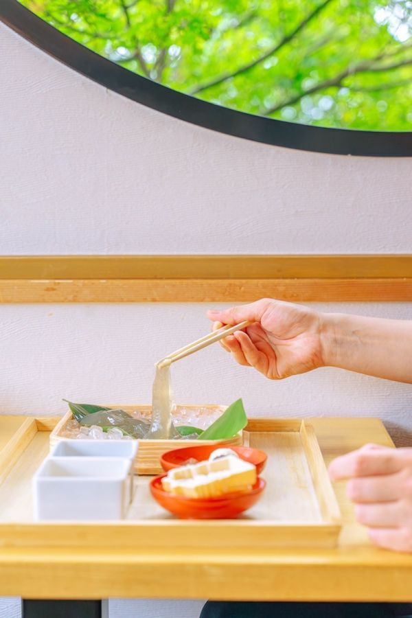 何より目を引くのが、この氷の器です! なんとも涼やかなビジュアルで、残暑厳しい京都観光の合間の癒やしになりますね。もちろん見た目が美しいだけではなく、氷で冷やし続けることでもちもち感をより際立たせているのだそう。