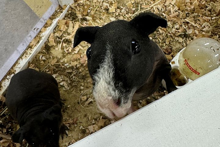 「おやつちょうだい!」とつぶらな瞳でこちらを見つめるのは、スキニーギニアピッグ。