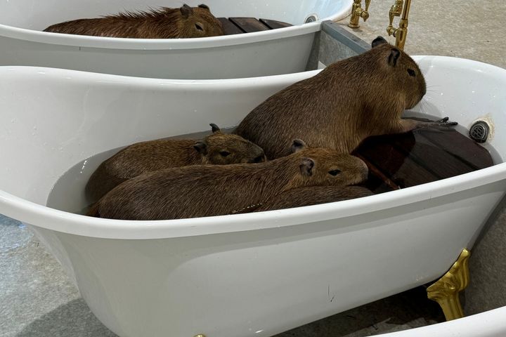 取材時、カピバラたちはバスタイムを楽しんでいるところでした。