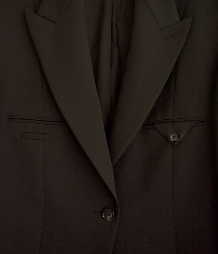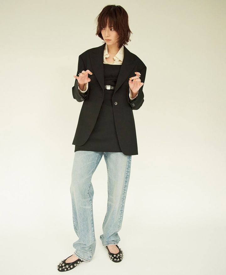 トレンドを制する王道の1着。シングルブレストのテーラードジャケットに、シャツ、ストラップミニドレスを重ね、さらにデニムをイン。脱シンプルなツイストのきかせ具合が今っぽい。