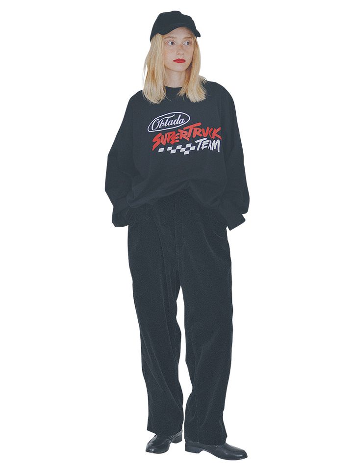【POINT】さらっとしたロンTとバランスをとる重みのある太パンツ。コーデュロイのほんのりとしたツヤによる奥行きや、縦のうねも相まって、ゆるいフォルムでまとめてもどこかスマートさを残せる。
