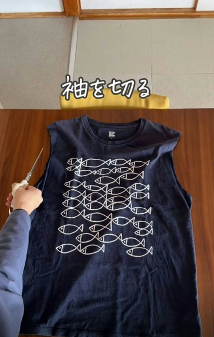 まず、Tシャツの両袖を布用ハサミでカットします。