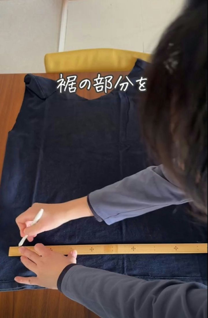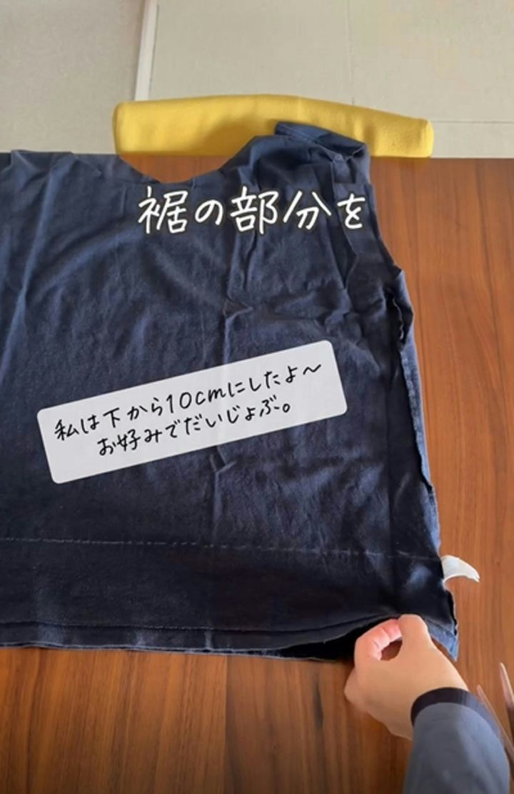 続いて、Tシャツを裏返し、裾の部分を下から10㎝の高さで印を付けます。