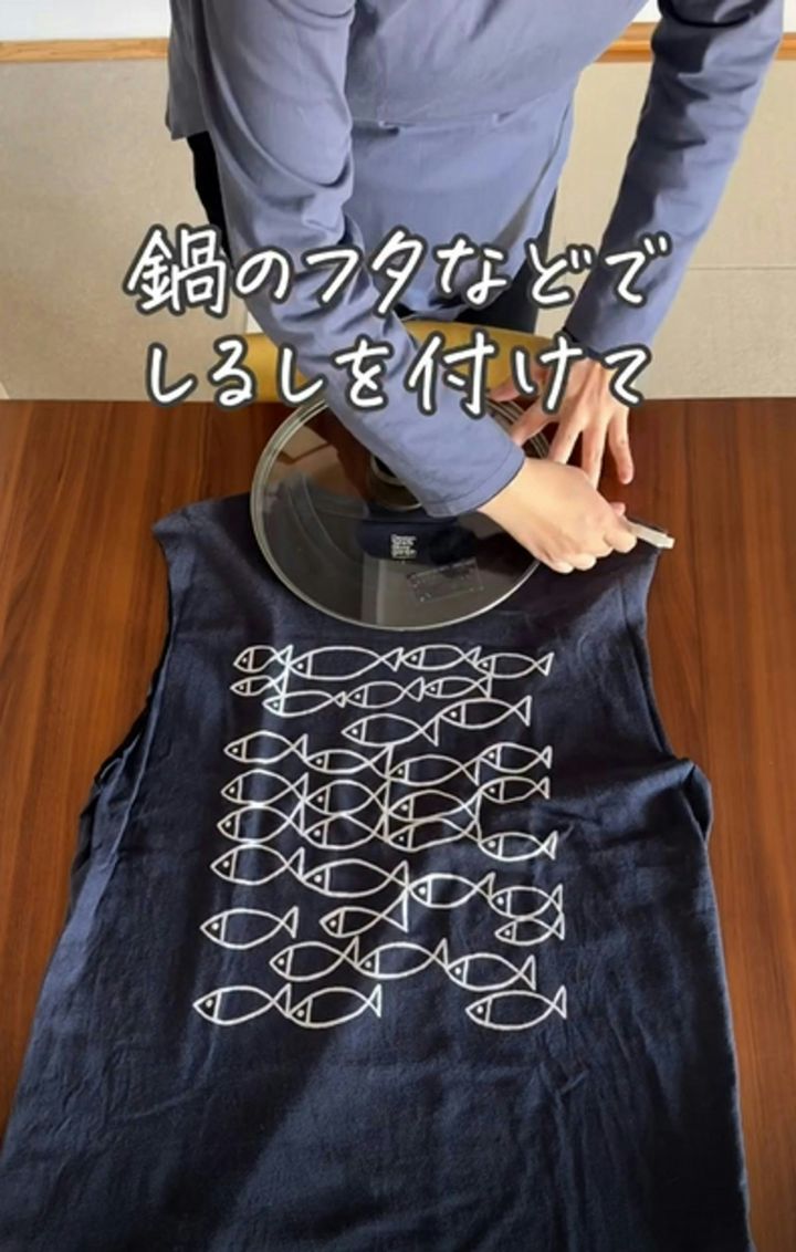 次に、鍋の蓋などを使って、Tシャツの首周りの部分に印を付けます。