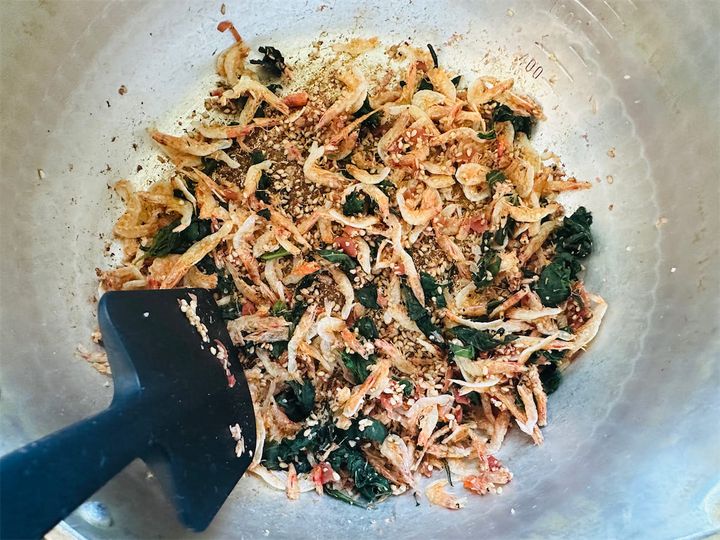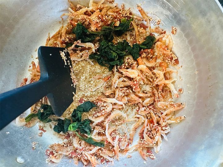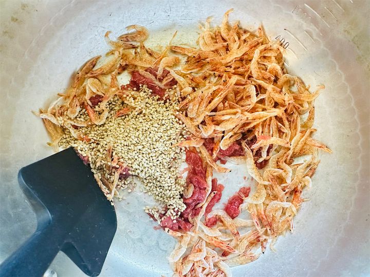 3.鍋に、細かく刻んだ梅干しと桜エビ、切りゴマを入れ、から炒りする。1の青じそを加えてカラカラになるまで炒る。