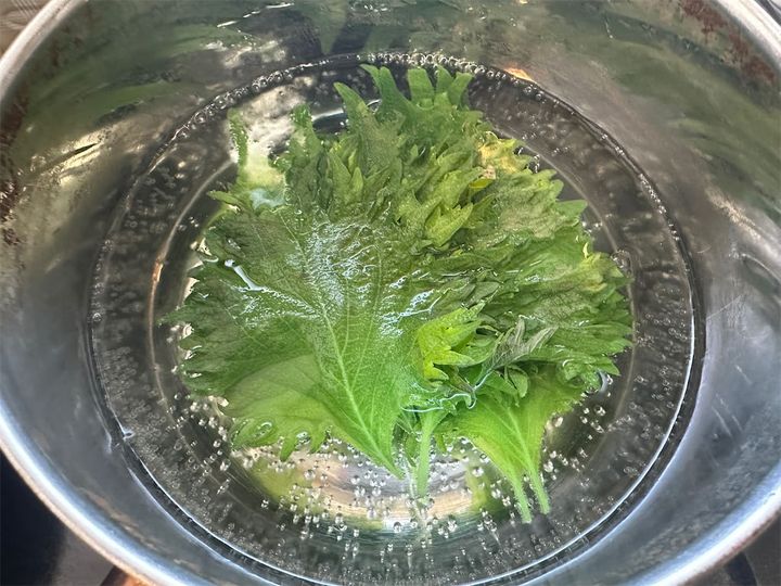 まずはサッと茹でます。青じそを茹でるのは珍しいですよね。