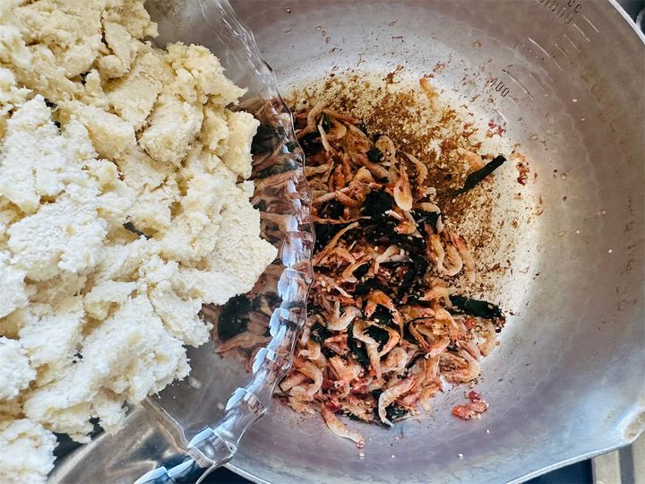 4.32のおからを入れる。塩とだしの素で味を付けて炒る。