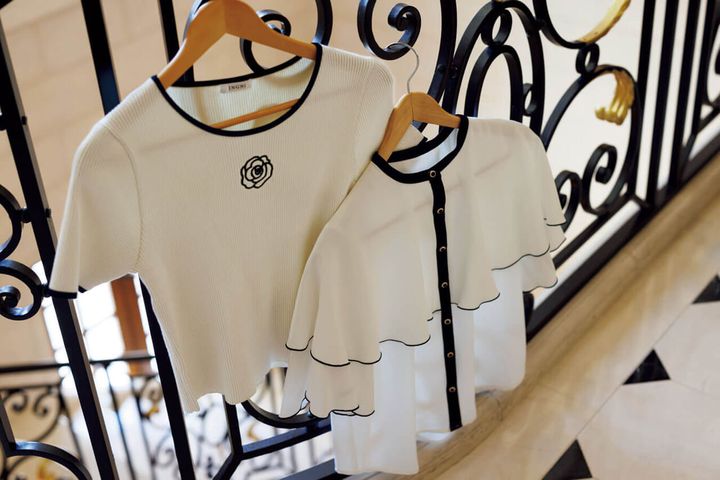 (左)首元&袖元に配色入りのリブニット。「カメリアデザイン」を思わせる胸元の刺繍が、オードリーらしいおしゃれなアクセントに。