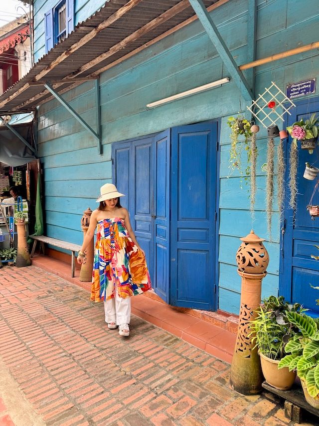 続いては、街歩きをしていて見つけた素敵な外観です。メコン川沿いに面した道を歩いていると、素敵な青の外観がありました。こちらはゲストハウスの外観ですが、道に面しているので撮影は自由! こちらに限らず、街の景観を大事にしながら、フレンチシックな配色やデザインされた建物が多いのでお気に入りを探してみては?