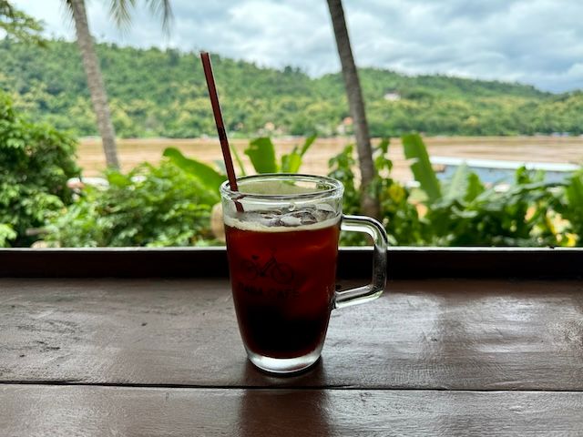 外装も可愛いので、写真を撮ると映えるのですが、道路を渡って反対側のテラスでは、メコン川を眺めならゆっくりとコーヒーを楽しむことができます。