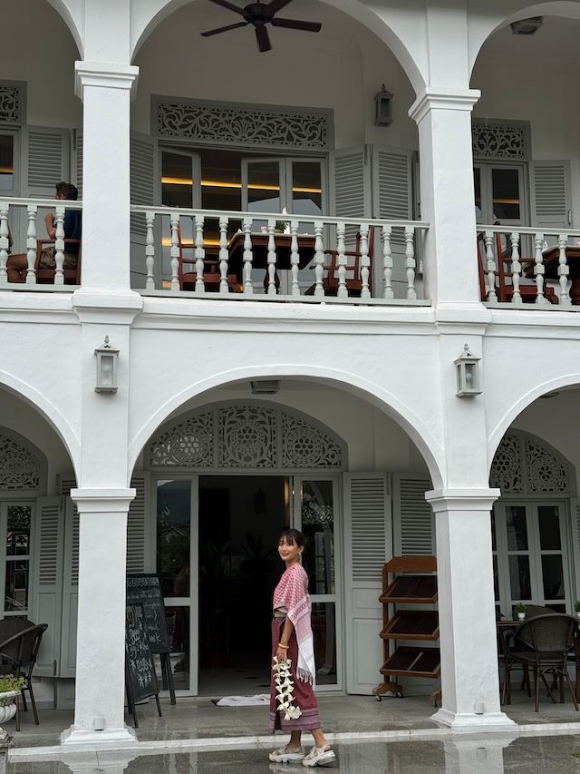 また可愛らしいホテルがありました! こちらは、王族の邸宅としてかつて使用されていただけあり、白亜の建物は東南アジアにいることを忘れてしまうほど。2階のパティオを含めて撮影すると、「ここどこ?」と言われるような素敵な写真に。2階のテラスには宿泊客でなくても入ることができます。バーになっており、飲み物をオーダーすれば、屋根付きの屋外バーとして楽しむことができます。
