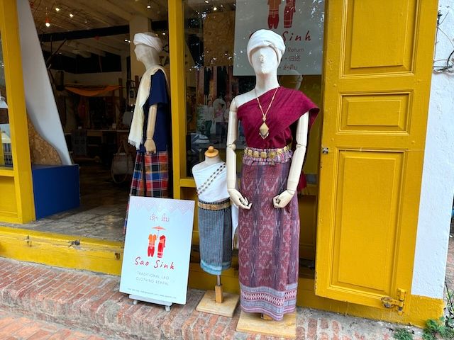 伝統服を今回借りたのはSao Sinh。黄色い壁が特徴です。2つのタイプの伝統服を主に取り扱っており、男性用、女性用の準備があります。2階のアトリエにあがると、衣装がずらり! 好きな配色を選び、着ている服を預けるロッカーも完備されています。筆者は、4時間コース(800,000キップ)を選び、上記の場所などを散策しました。