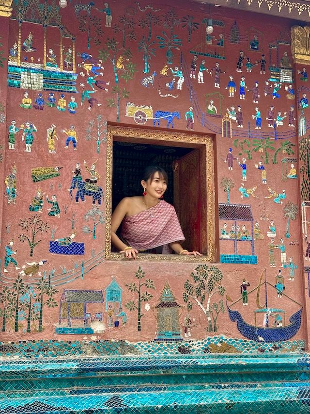 中から外を見られるようになっていて、ここから顔を出して撮影するのも人気です。この壁画は仏の絵ではなく、ルアンパバーンで生きる人々をテーマにしており、じっくりと見ても興味深い内容です。
