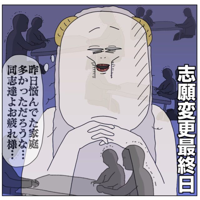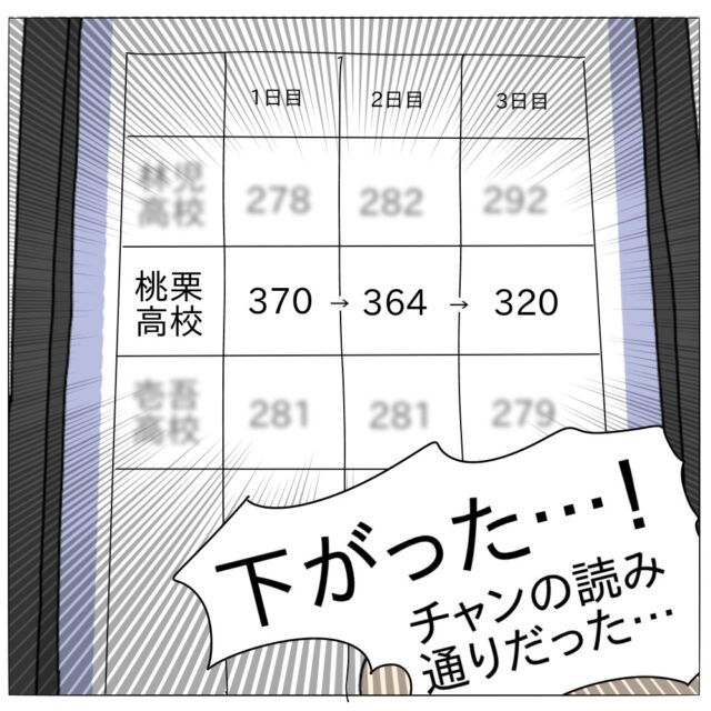 勉強が嫌いで苦手な中学3年生の長女リコちゃん。公立高校の倍率発表の日を迎えチャーさんと確認したところ、志望校である桃栗高校の倍率が例年より高く衝撃を受けました。倍率確定後、一度だけ志望校を変更できるため家族会議を開き、倍率1.45倍の恐ろしさを痛感したものの、夫チャンの「致しません」の一言で志望校変更はせず、「志願変更の三日間で倍率は下がる!」とドキドキしながらも賭けに出ることにしました。
