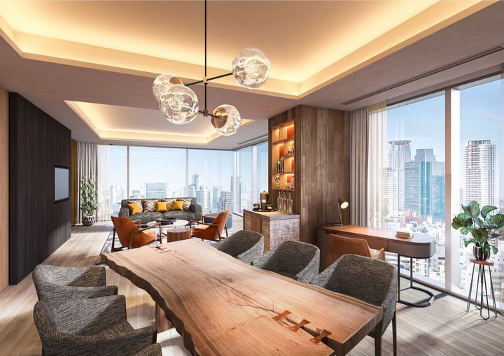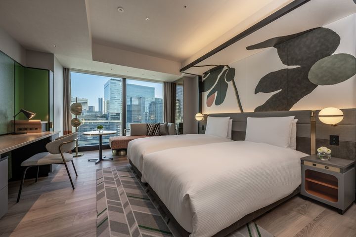13階から 25階までの客室は、53 のスイートルーム、19のコネクティングルーム、ペットと宿泊できる「ペットフレンドリールーム」を含む全 308室。全室に設置された、レトロな冷蔵庫を模した遊び心あふれるミニバースペースや、関西が起源といわれる福徳招来の縁起物である福助人形など、大阪に脈々と受け継がれる歴史と文化、商人魂や陽気で明るいバイブスを表現した印象的なインテリアがエントランスから客室までを彩っている。