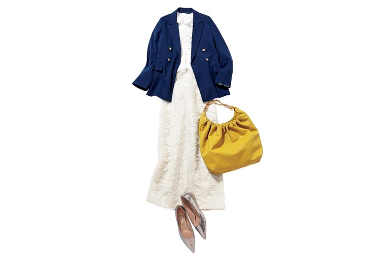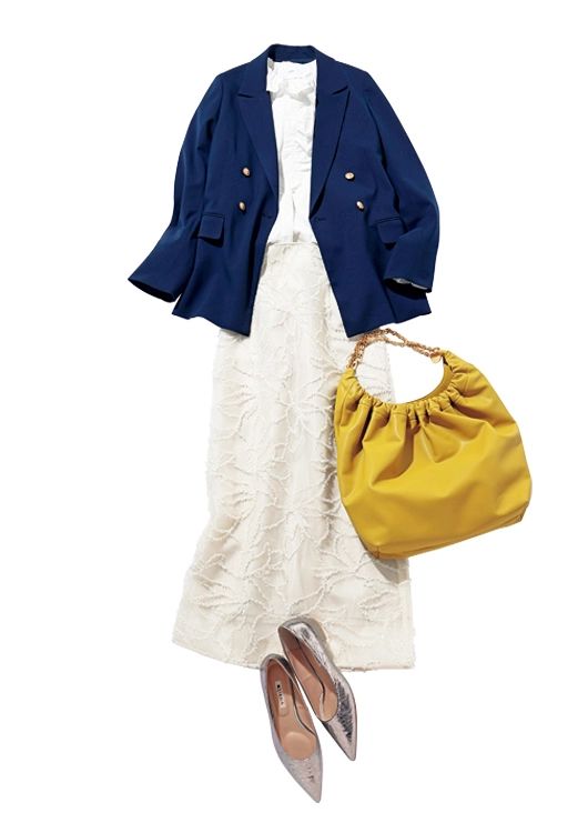 紺ブレが主役のきれいめコーデ。ブラウスのフリルがほどよく花を添えてくれます。フェミニンなレーススカートも、紺ブレとシルバー靴で締めることで、キリッとシャープな印象に。