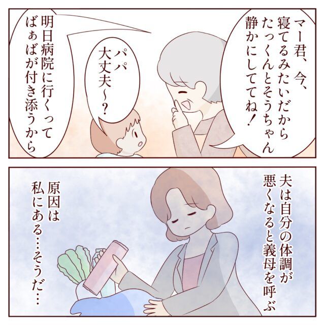 モエさんの家は夫のマサキさん、息子のタクミくんとソウタくんの4人暮らし。モエさんには悩みがありました。それは、マサキさんが体調不良になる度にお義母さんを家に呼ぶこと。ある日、仕事から帰宅するとお義母さんが来ていました。モエさんはお義母さんが家にいたことでマサキさんの体調不良を知りました。その日は看病のため、お義母さんが泊まることになりました。