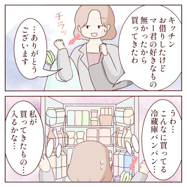 モエさんはお礼を言いつつ冷蔵庫を開けると既に冷蔵庫がパンパン。買ってきた食材が入らないほどです。