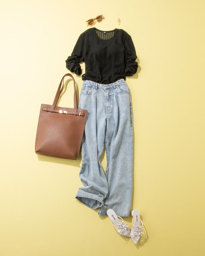 季節の変わり目にもってこいのシアーニットは、ぜひ着回しに取り入れたい。網目が細かく透けすぎないので、インナーにキャミを着ても露出感が抑えられるのでオススメです。