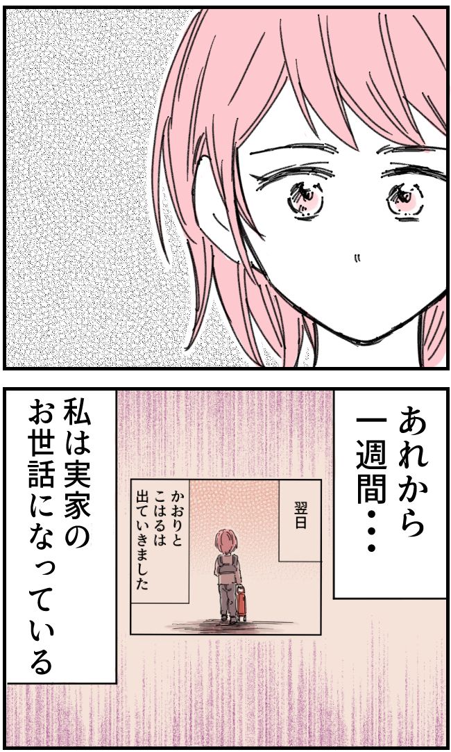 「あれから一週間・・私は実家のお世話になっている」かおりさんがこはるちゃんを連れて家を出てから、ちょうど一週間が経ちました。