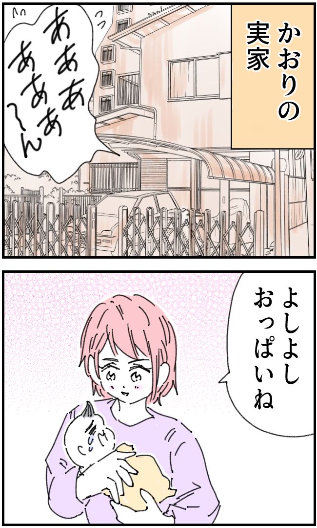 「オムツと着替え、出しておくわね。あと、あんたのお昼、冷蔵庫に入ってるから」と言うお母さんに、「ありがとう」とお礼を言うかおりさん。すると「じゃあ、お父さん手伝いにお店に行くわね」そう言ってお母さんは家を出て行きました。