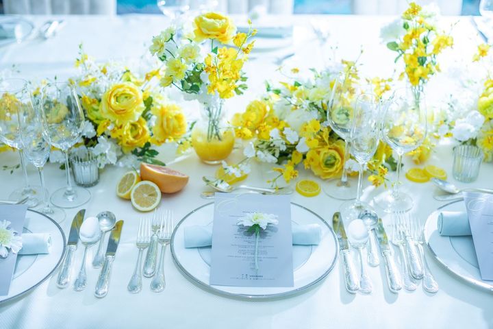 会場のグレーやベージュのカラーリングにもぴったりなのがイエローの花材。さまざまな形や質感の花をあえてミックスしてまとめることで、ナチュラル感を演出しています。