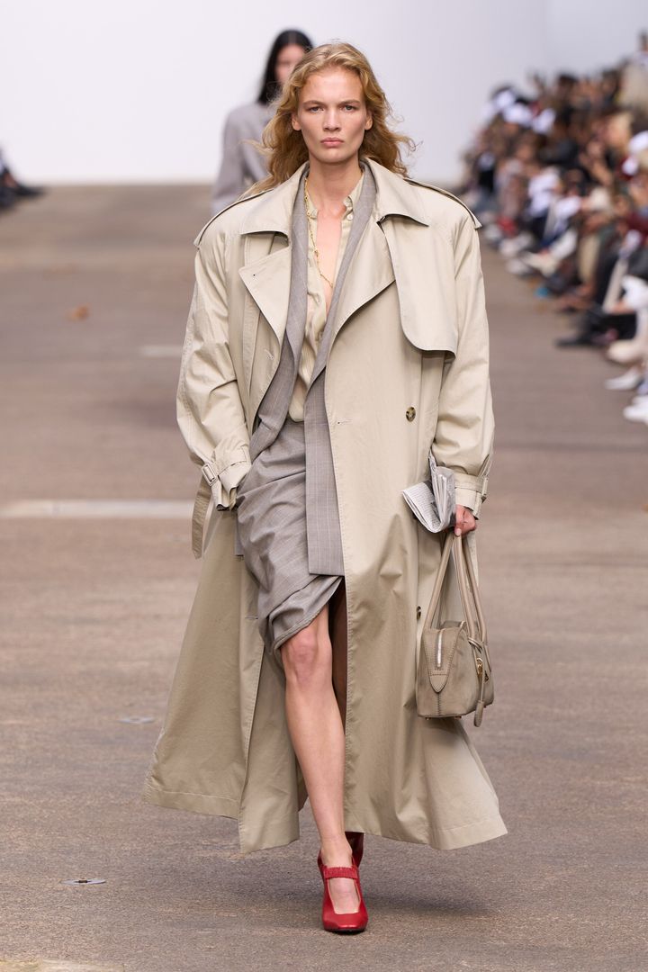 今シーズンは、ビッグショルダーのスーツにゆったりとしたトレンチ、そしてイブニングドレスに繊細なランジェリーと、デイ&ナイトに着られるルックから構成されている。足もとには、80年代のシャルル・ジョルダンのシューズを想起させるヒールサンダルや、私たちの内なる闘志を刺激するようなボクシングブーツがスタイリングされていた。