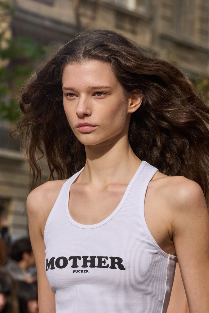 バックステージでのインタビューに話に戻そう。マッカートニーのお気に入りのルックは、リサイクルペットボトルで作られたブルーのふんわりとした雲のようなミニドレスだという。なぜ「Mother」という言葉をタンクトップに選んだのかという質問には、「私たちはみんな母親だし、母なる地球に住んでいるから」だと。しかし、その下に罵り言葉である「f*cker」が小さくプリントされていることは、あまり大きな声では言えないそうだ。