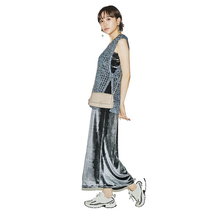 セットのニットベストを重ねてカジュアルダウン。長時間座っていてもシワになりにくく、ストレスフリー。ワンピース[ニットベスト付き]¥26,400(ミースロエ)バッグ¥29,500(イアクッチ/IACUCCI 大丸東京店)スニーカー¥15,950(エミ/エミ ニュウマン 新宿店)イヤリング¥3,850(ミミ サンジュウサン/サンポークリエイト)
