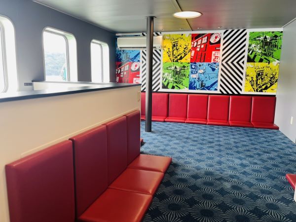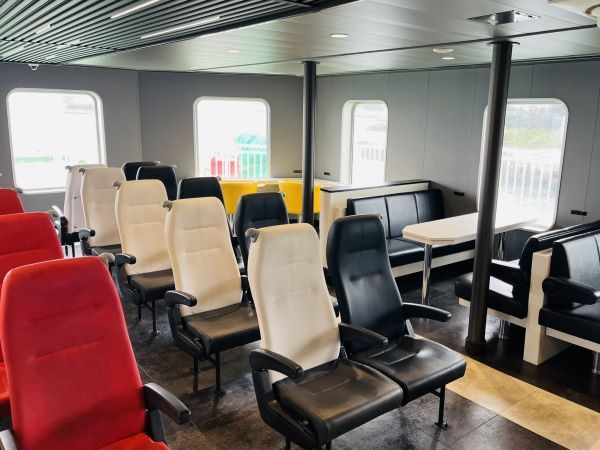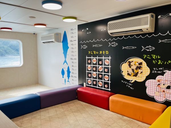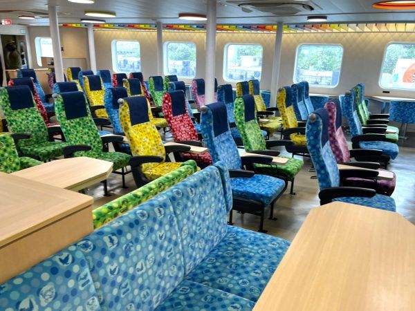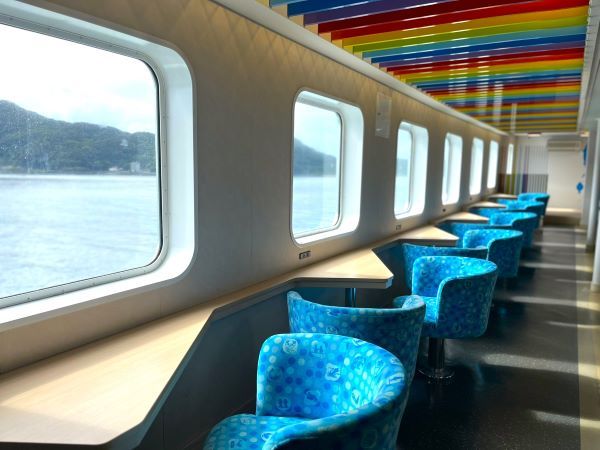 初めて船内に入った時は、カラフルな椅子席に驚きました!当時、「フェリー」には幼い頃に乗った昔の印象しかなかったので、とても気持ちが明るくなりました。4人掛けや6人掛けのお席もあり、家族やお友達と向き合って過ごせるのはいいですよね。もちろん椅子席だけでなく、桟座席もあります。