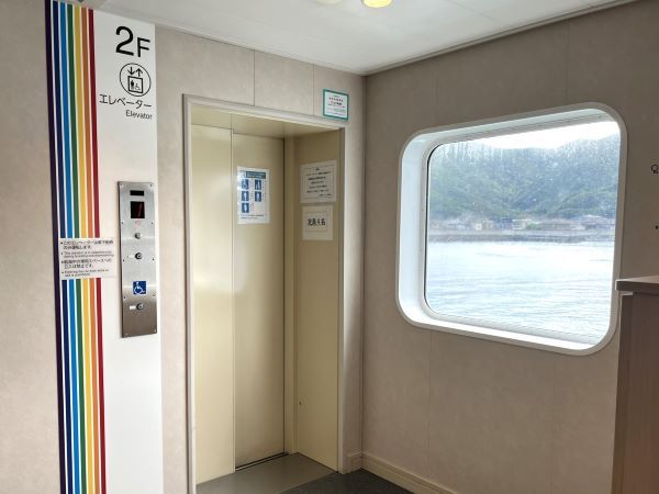 中の様子はわからなかったのですが、2Fにベビールームもありました。それに2Fのトイレには、男女ともにベビーチェアがありましたよ。エレベーターもありますので、幅広い方が利用しやすいフェリーです。